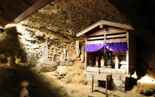 観音堂前の岩穴をくぐり抜け、山道を登ると奥の院があります。その道中には、ありのままの雄大な自然、尾根近くの岩棚に並ぶ石仏群などがあります。
